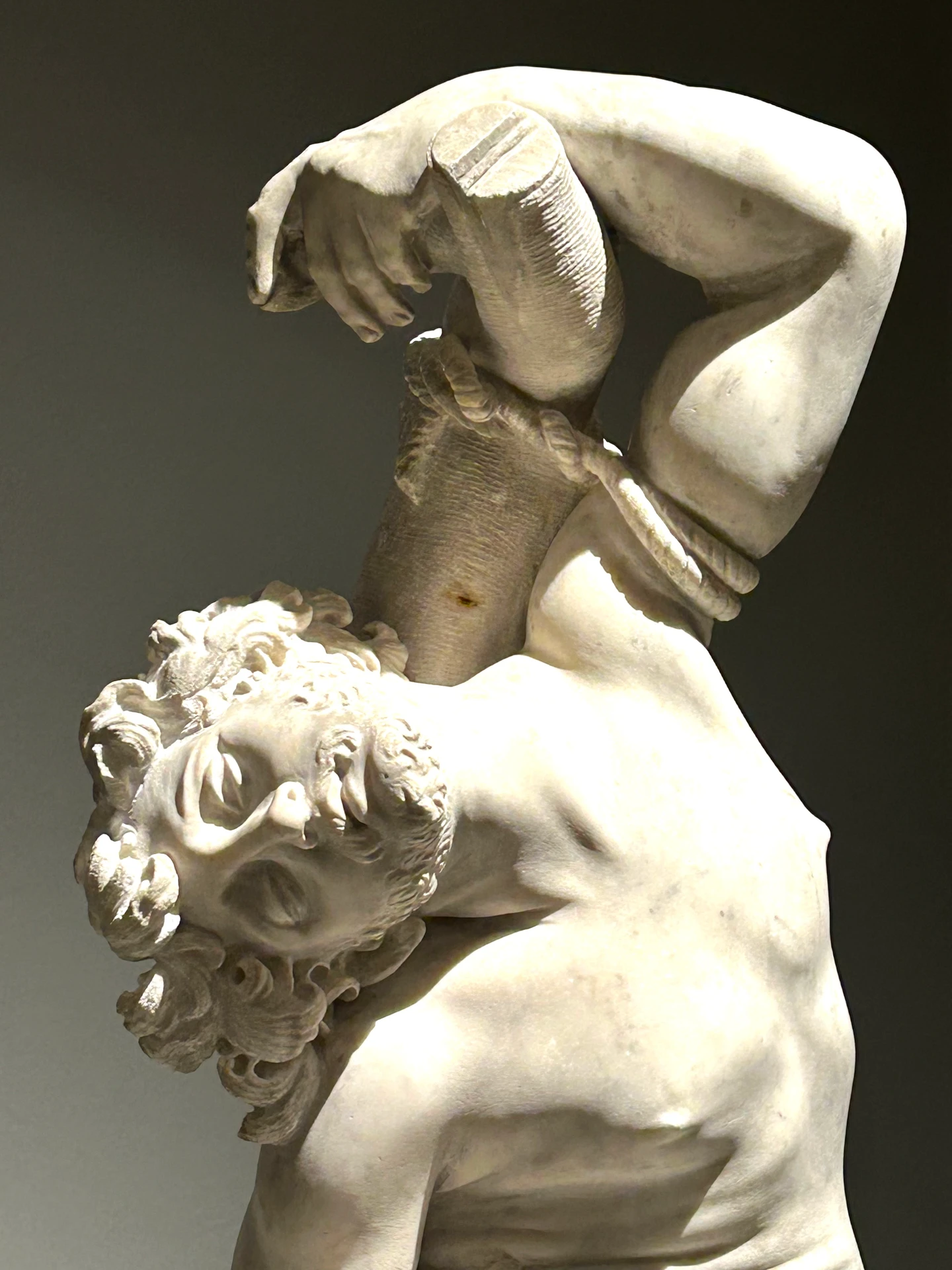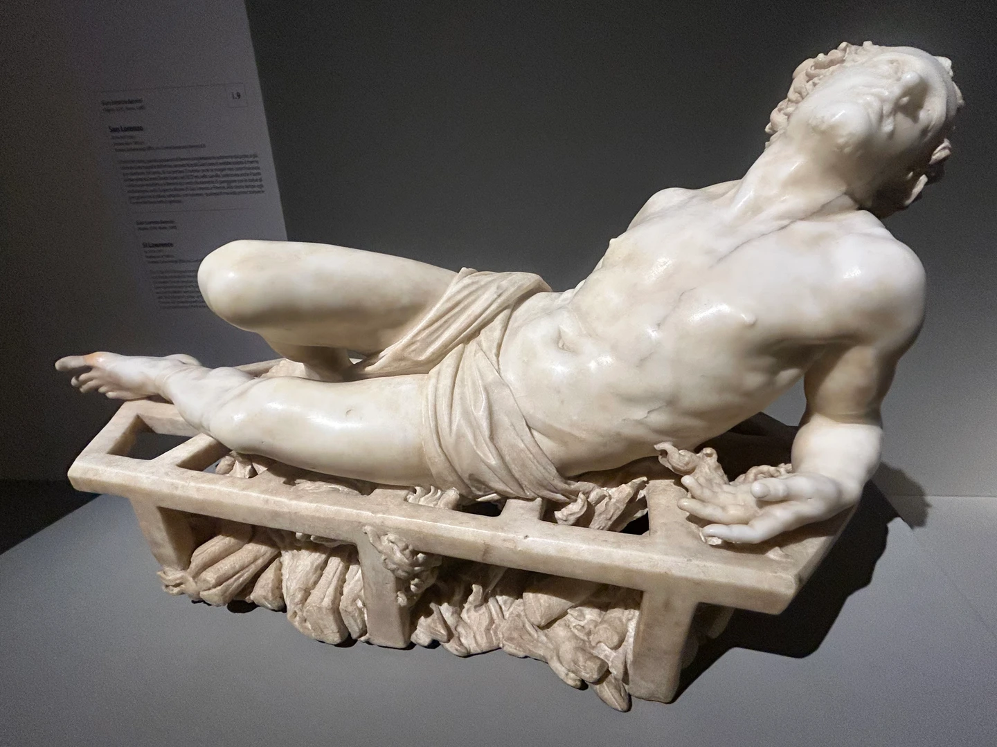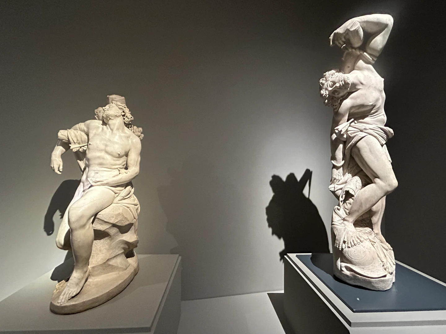 La prima sala del percorso si apre subito con una ricca carrellata di opere di candido marmo che si stagliano sull'azzuro carta da zucchero che fa da sfondo all'allestimento. Un candido bagliore di cui Bernini è sovrano. Qui tuttavia si intrecciano i destini del padre Pietro e figlio Gian Lorenzo che nei primi anni camminano insieme tanto da rendere difficile comprendere chi è l'artefice tra i due in alcune delle opere esposte, ma passando da un'opera all'altra sarà come avvertire un farsi strada di un segno sempre più "vivo", vibrante ed intenso. Il segno di un giovane Gian Lorenzo Bernini che presto dimostrerà di avere superato il padre, riuscendo a dare vita al marmo come nessuno aveva fatto fino ad allora. Due raffigurazioni di San Sebastiano sono cosi meravigliosamente sensuali che risultano ipnotiche e di una perfezione disarmante. San Lorenzo è troppo bello per poter bruciare tra le fiamme di marmo realizzate quasi da sembrare accese. Teatrale, potente, sensuale così si presenta G.L. Bernini al cospetto di Scipione Borghese e poi Maffeo Barberini e la sua famiglia. Saranno gli anni delle opere che popolano Gallerie Borghese e che tanto amiamo e che forse ora dopo questa sala riusciremo a collocarle meglio nel percorso di crescita del nostro Bernini.